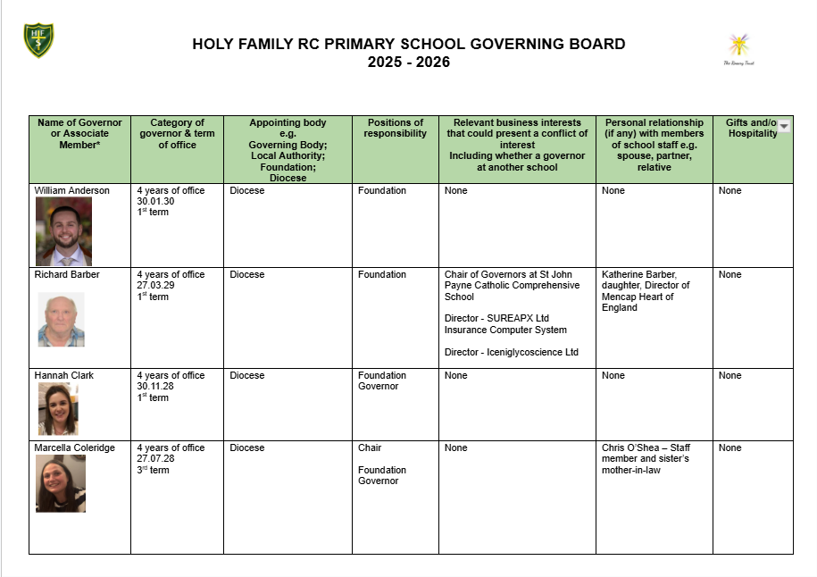 Our Chair of Governors is Mrs Marcella Coleridge - can be contacted c/o the school office.
